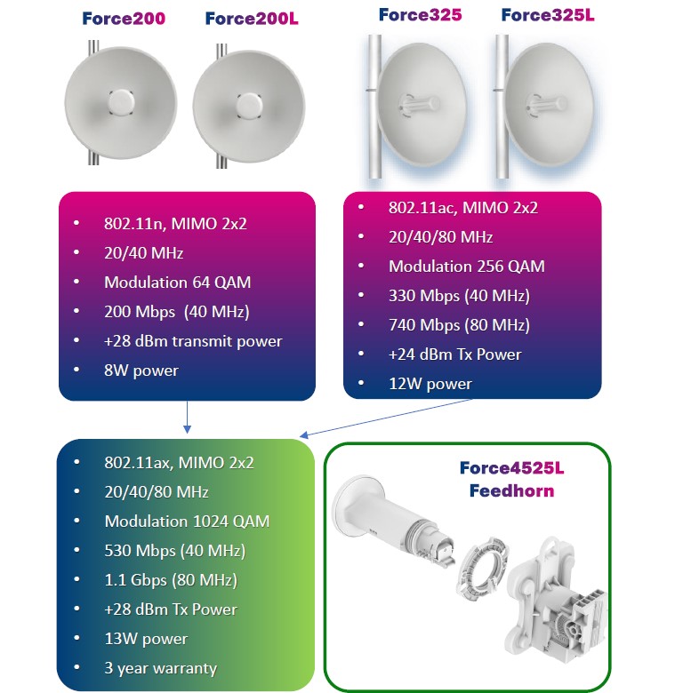 Predstavljamo novi ePMP korisnički modul kao feedhorn bez dish antene, napajanja i nosača koji služi da modele starijih generacija poput ePMP Force200/Force200L/Force325L/Force325 jednostavno ažurirate na zadnji krik tehnologije zamjenom feedhorna i unaprijedite performanse postojećih radijskih linkova.